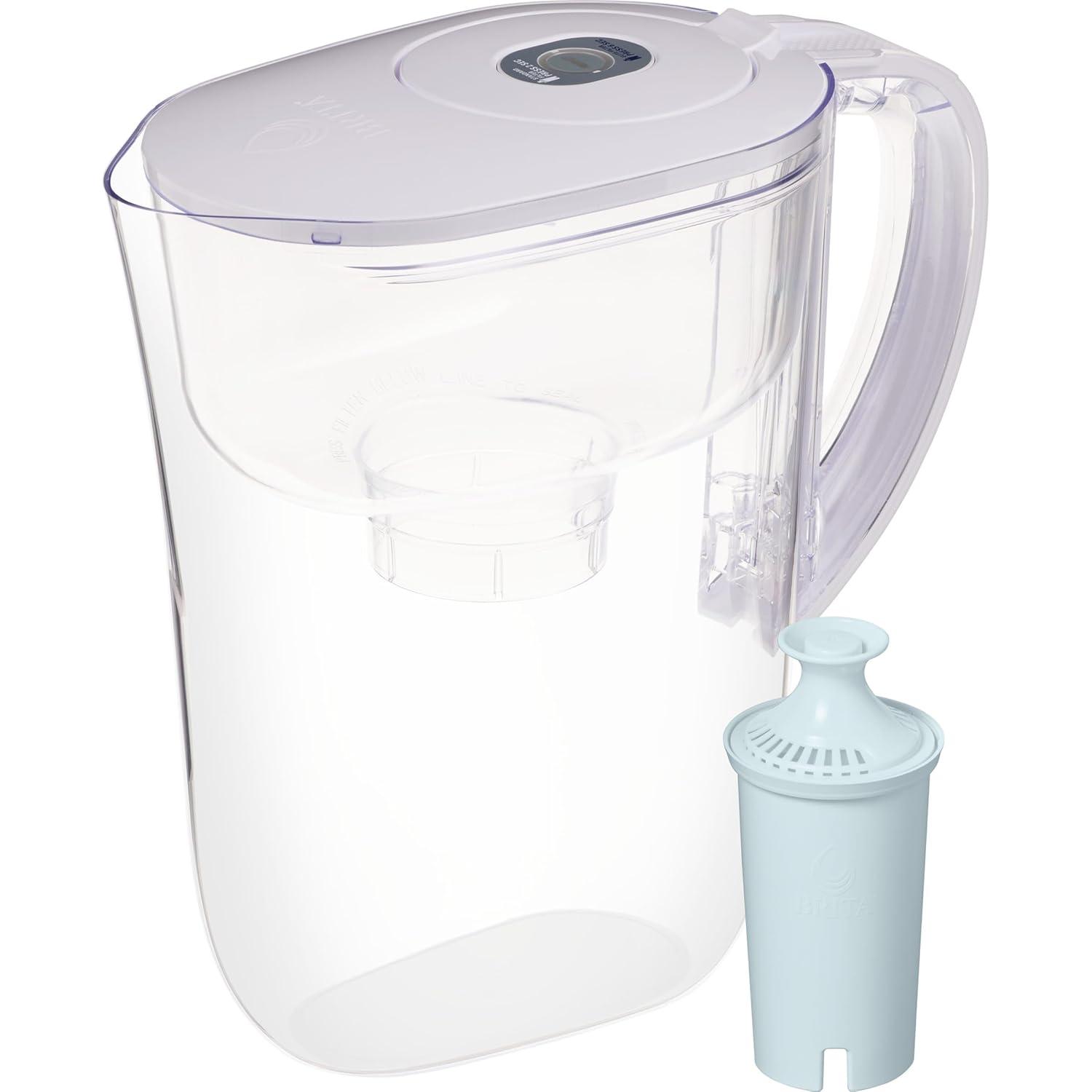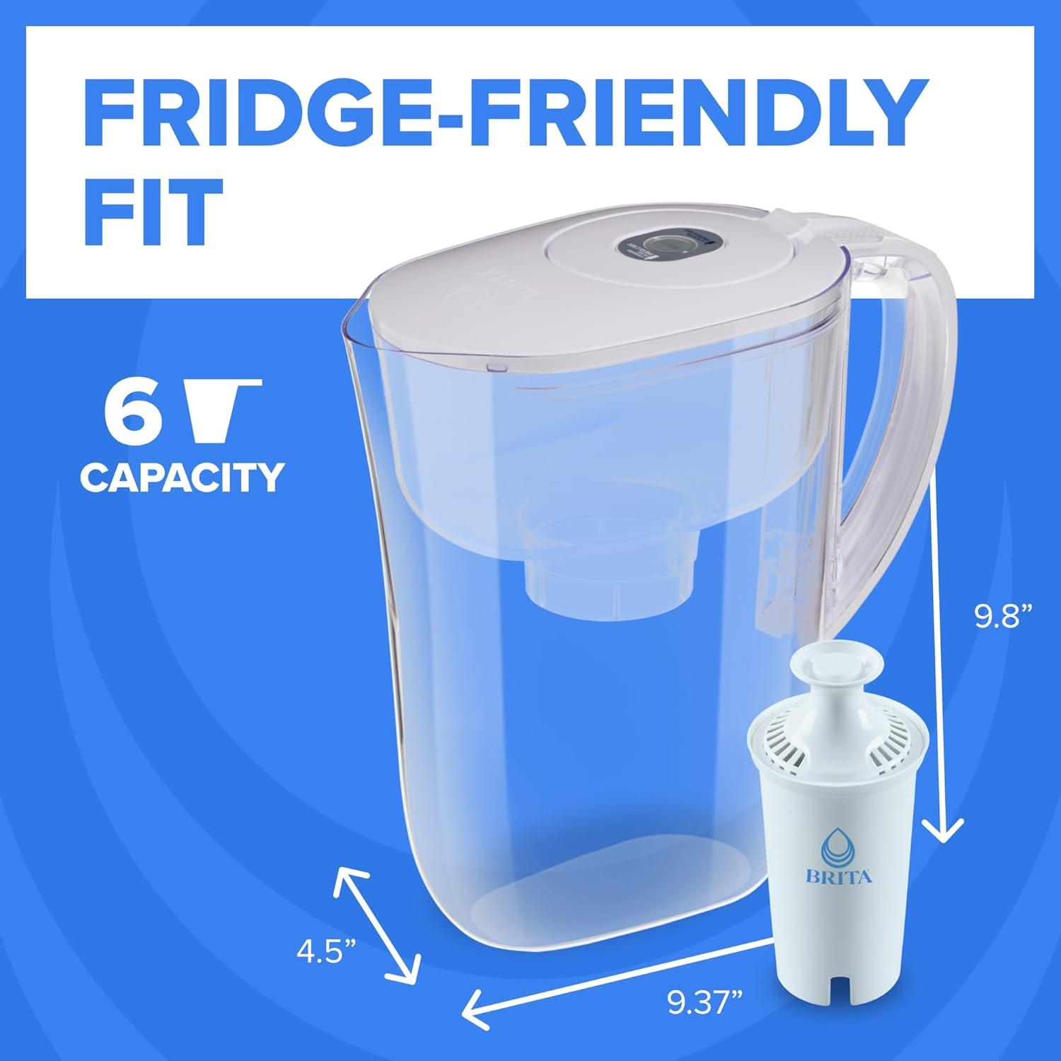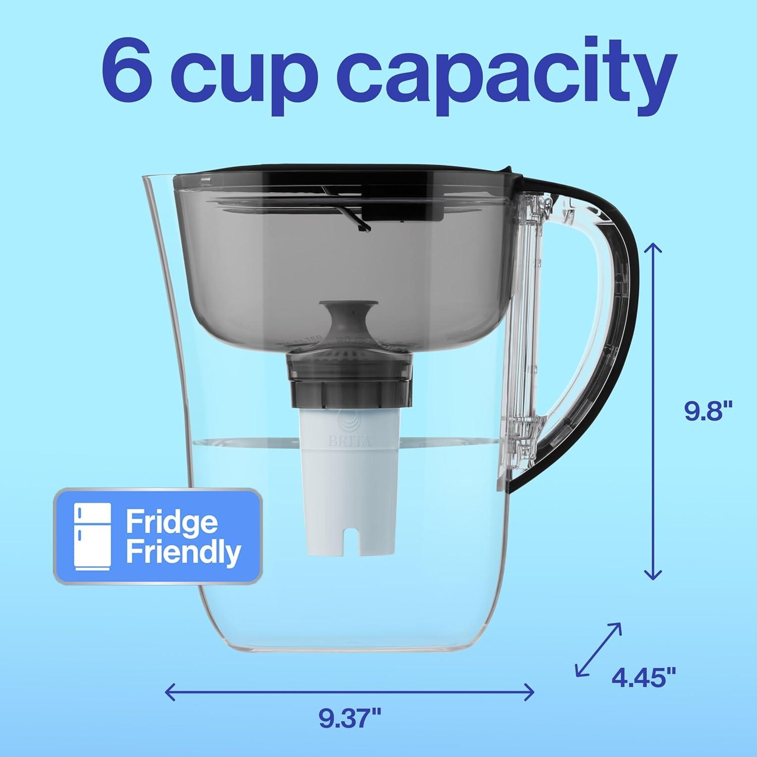 Drink great tasting tap water with this Brita 6 cup water pitcher, made without BPA, and the included BritaPlus Water Filter that traps 2X more contaminants*. This high density replacement filter uses activated carbon to reduce chlorine (taste and odor), copper, cadmium and more**. From the number one brand in water filtration***, this filter replacement lasts 2 months**** and saves $240 a year*****. Ditch single use plastic bottles with this refillable system that replaces up to 300 plastic bottles******. The SmartLight filter indicator is Brita's most accurate filter life indicator. *Vs standard Brita filters. See certifications. **See certifications. Substances reduced may not be in all users’ water. ***Based on IRI sales data. ****Approximate timing based on 40 gallon filter life and average family usage of 11 glasses per day. *****Vs. standard 16.9 fl oz single use bottles. Savings assumes pre purchase of Brita system. ******Standard 16.9 fl oz single-use bottles.