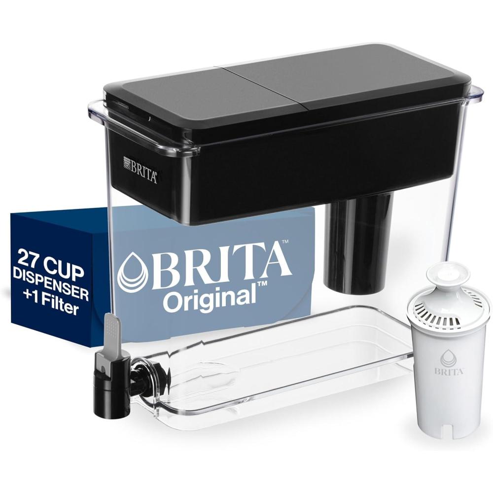 Drink healthier, great-tasting tap water with the BPA-free, large 27-cup Brita UltraMax Water Dispenser. This water filtration system cuts the taste and odor of chlorine, plus it reduces mercury, copper and other impurities to deliver great-tasting drinking water. By switching to this Brita water purifier, you can replace 1,800 single-use plastic water bottles a year to stay hydrated, save money and reduce plastic waste. This space-efficient Brita water dispenser is fridge-friendly and features an easy-locking lid and precision-pour spigot. The handy sticker filter indicator lets you know when it's time for a filter change. This Brita water dispenser comes with one Standard Brita water filter, but it's compatible with both Elite and Standard water filters. For the freshest-tasting water, replace your Elite filter after 120 gallons or approximately every six months, or replace your Standard filter after 40 gallons or approximately every two months. Get great taste, less waste and more savings from Brita.
